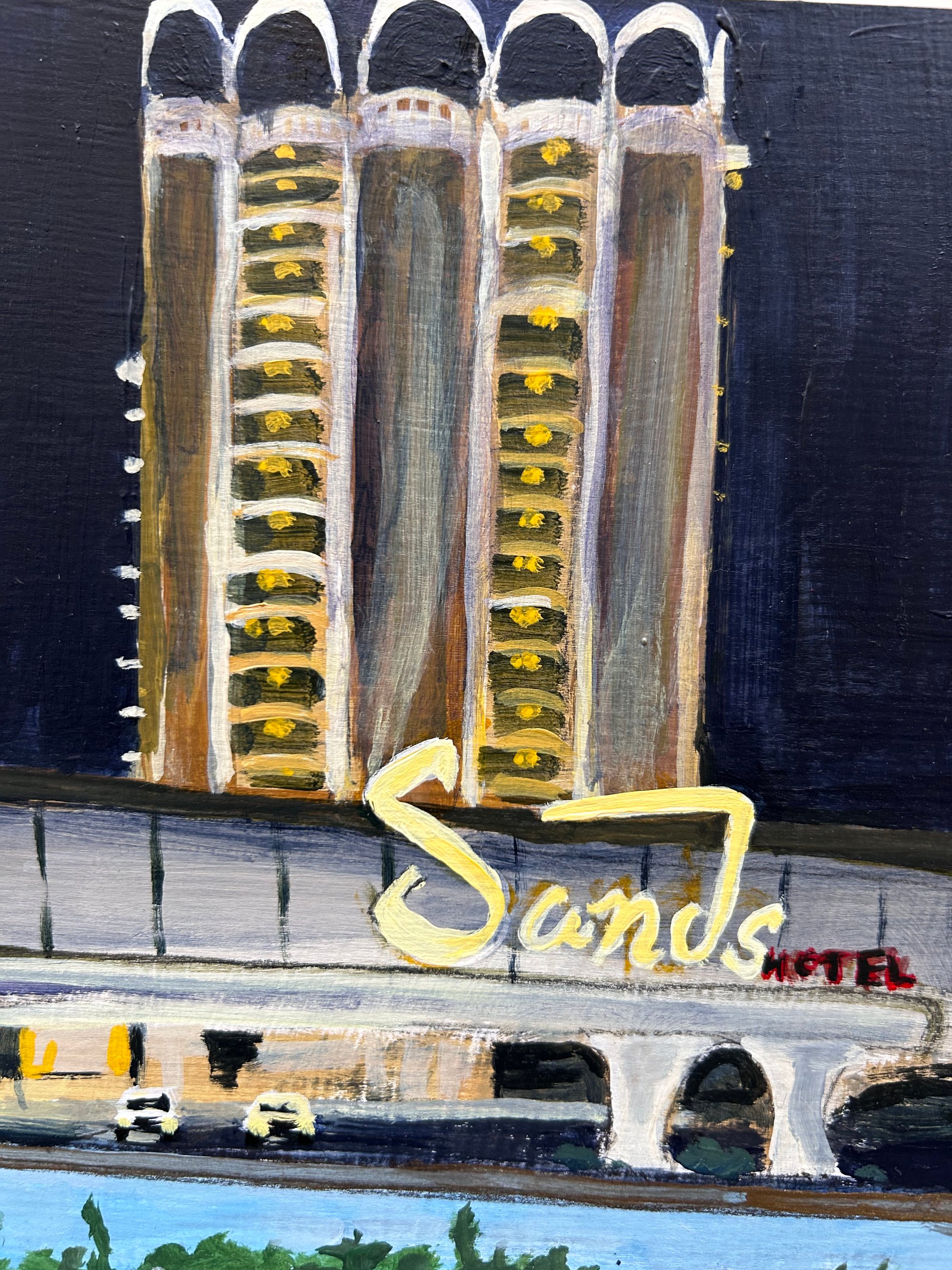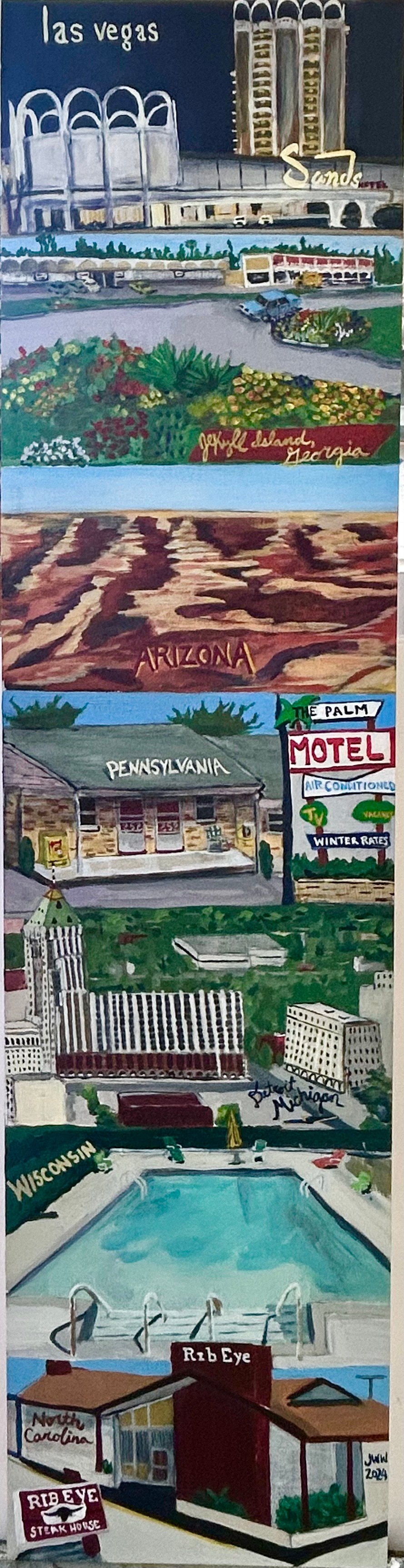 12" x 48". Acrylic on Panel with a natural wood lattice frame. Ready for hanging. This painting depicts all the swing states. Its like seven little paintings in one!