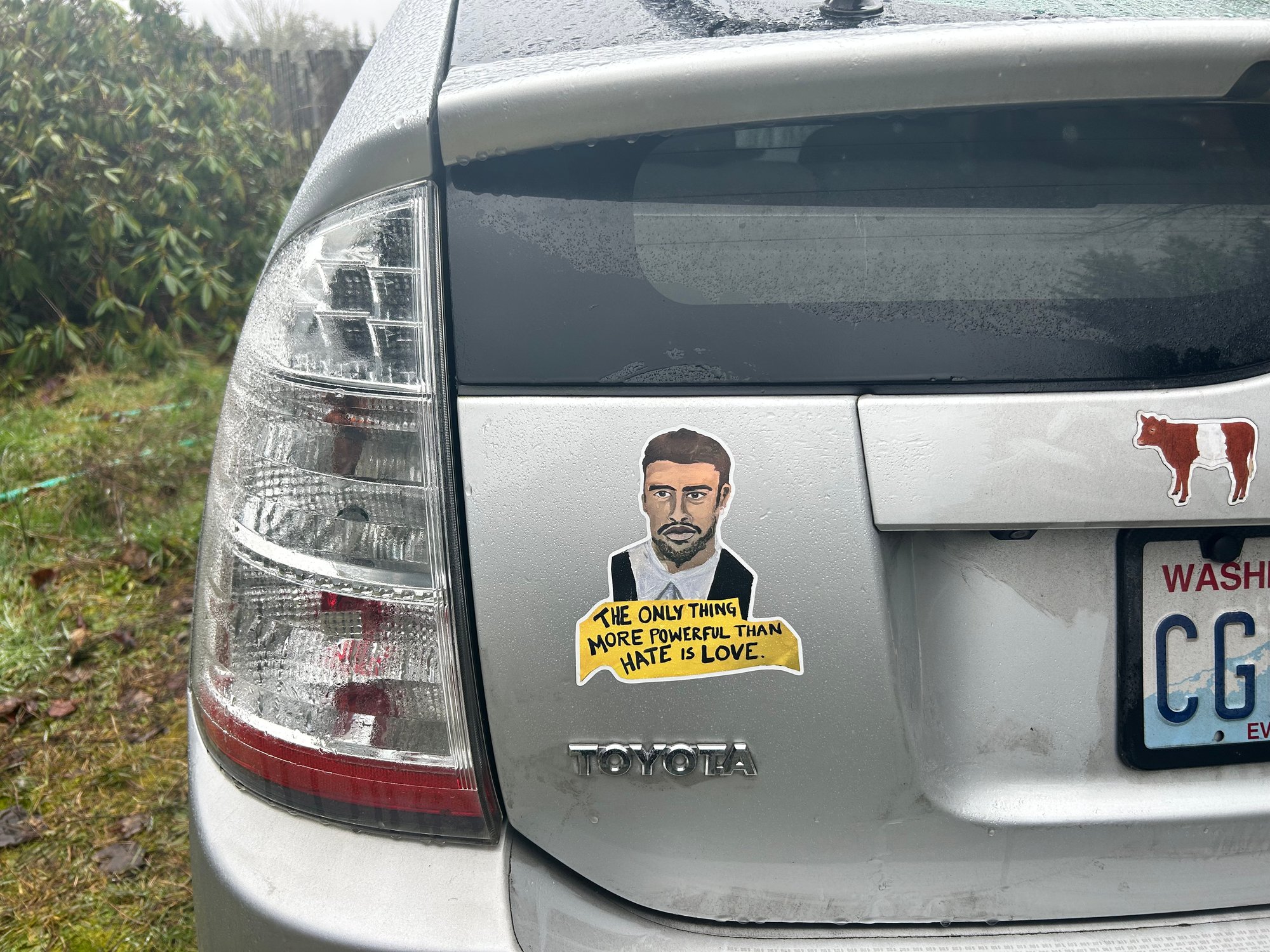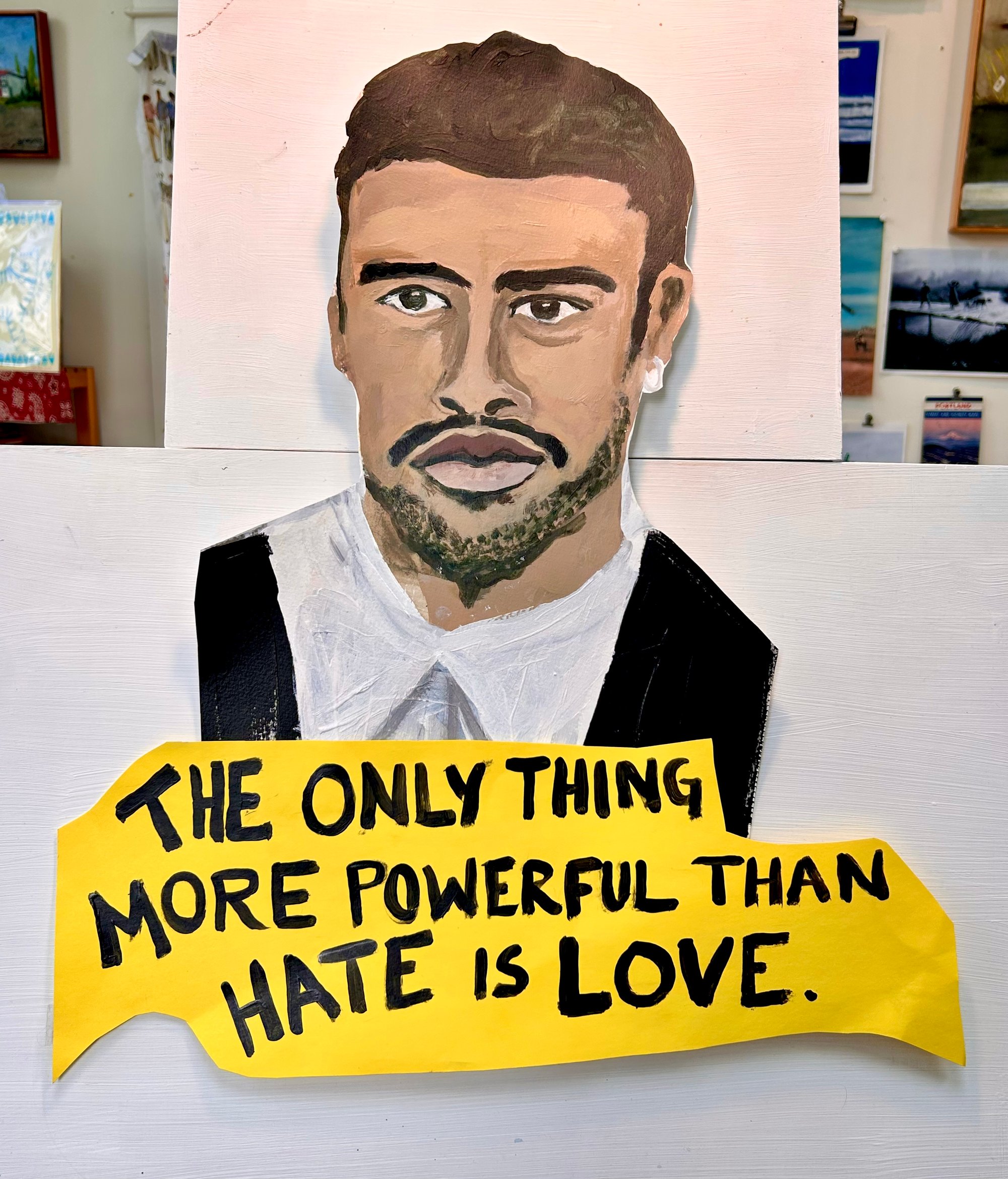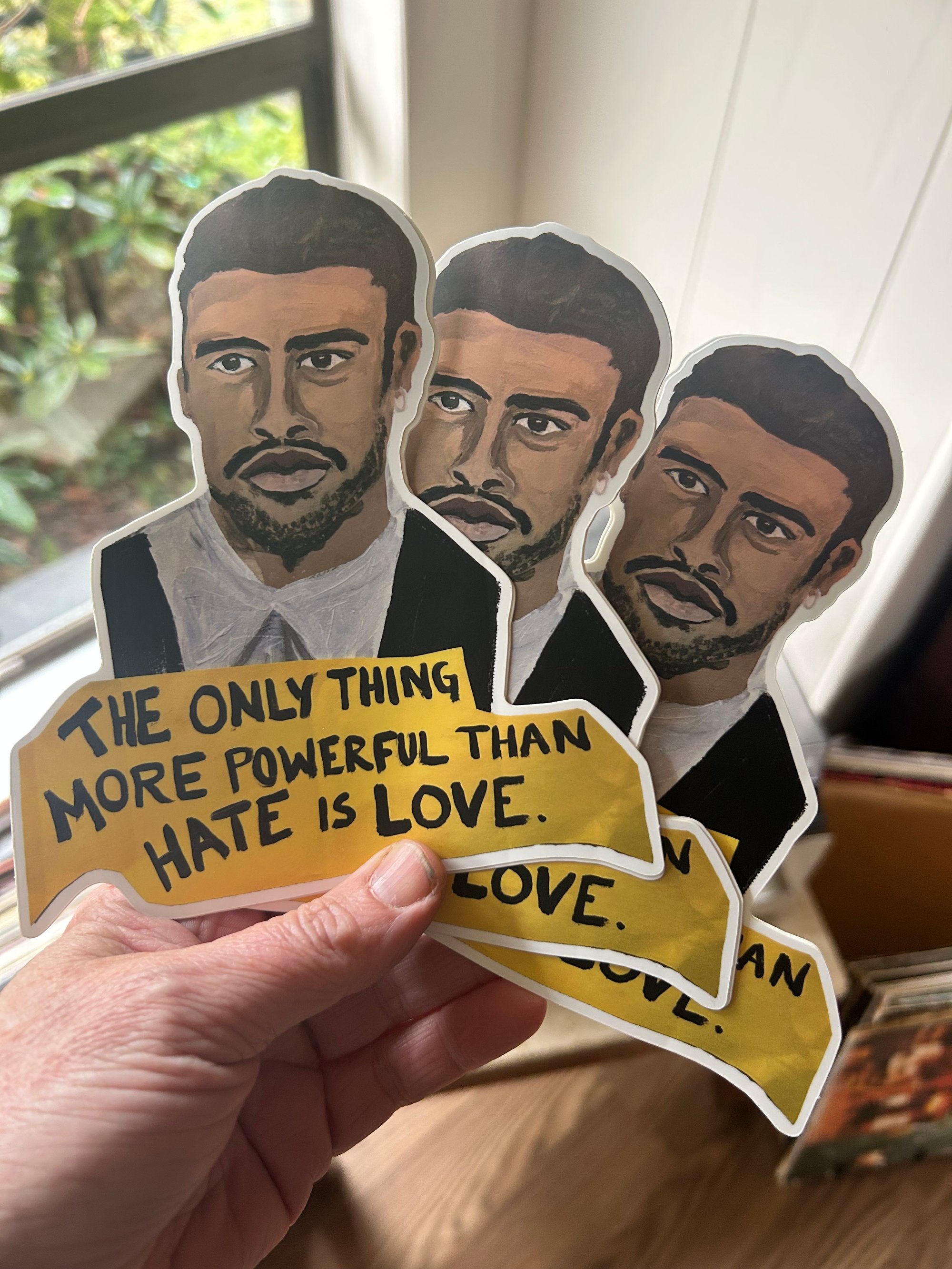 I was so inspired by Bad Bunny winning at the Grammys that I painted an oversized portrait of his head during my next studio session. Art is a major part of the Resistance. The sticker is about 6 by 5 inches.