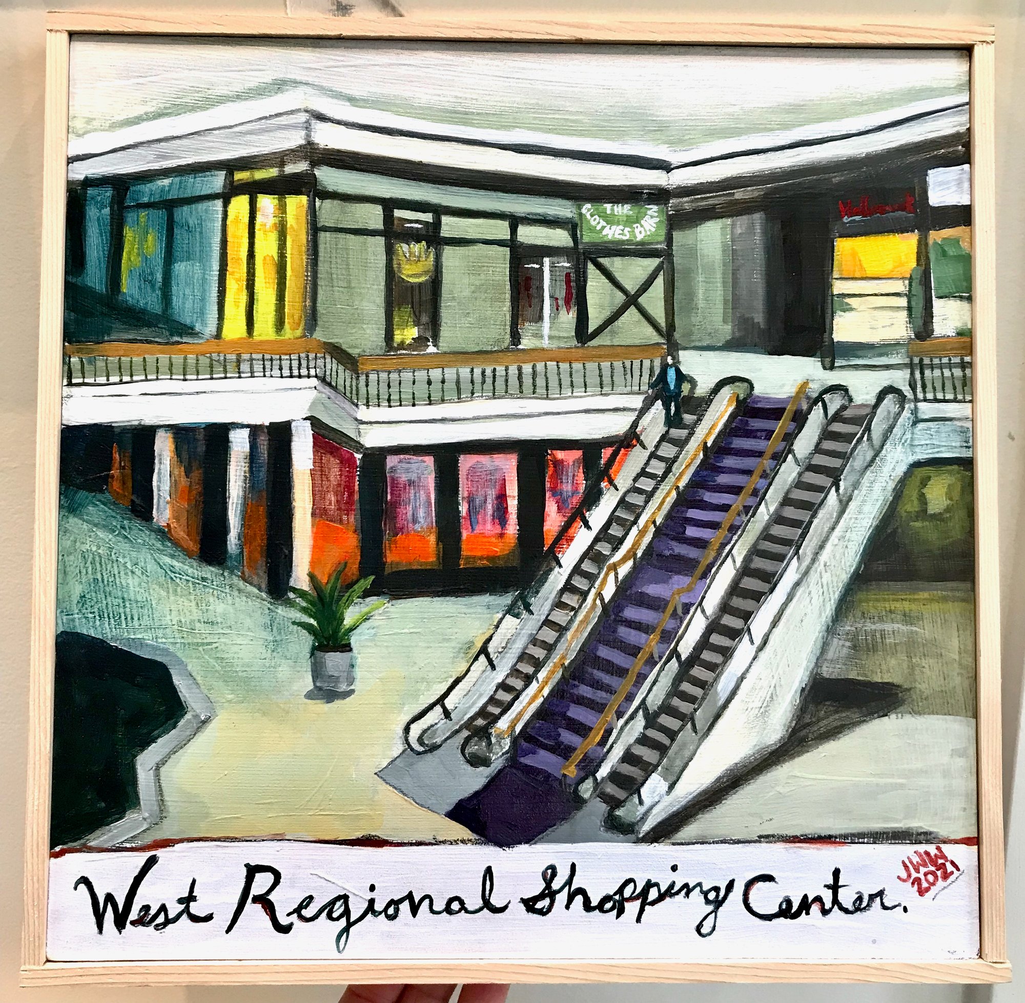 12" x 12". Acrylic on Panel with a natural wood lattice frame. Ready for hanging. This is part of the SMALL MALL series. I love the little guy on the escalator. I